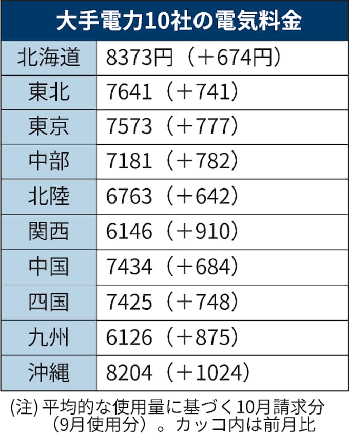 出典:10月の電気代、全社が642~1024円値上げ 政府補助縮小|日本経済新聞
